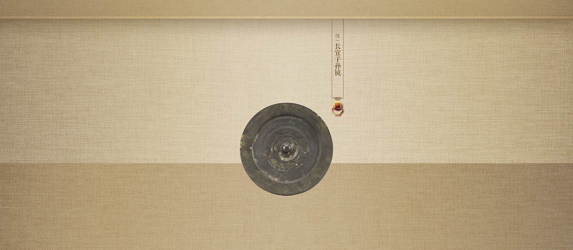 圆形,圆纽,柿蒂纹纽座,叶间饰铭文,外围带纹。内区为八内向平弧相连,两弧间各饰符号纹,外区饰八涡纹,间以斜线纹,素宽平缘,铭文“长宜子孙”。