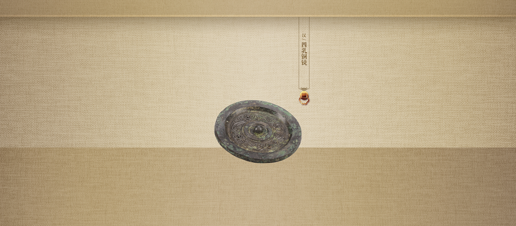 圆形,圆纽,宽平缘。圆形纽座,两组细短斜线纹圈带,内饰主题纹饰四乳与四虺相向环绕,四乳带有圆座。四虺为钩形躯体,两端同形,在身躯外各有一冠羽鸟纹。此镜纹饰布局采用四分法形式,即以四乳为基点,将镜背均匀分成四区,其间布置主题纹饰。此镜铸造精良,纹饰简洁流畅。