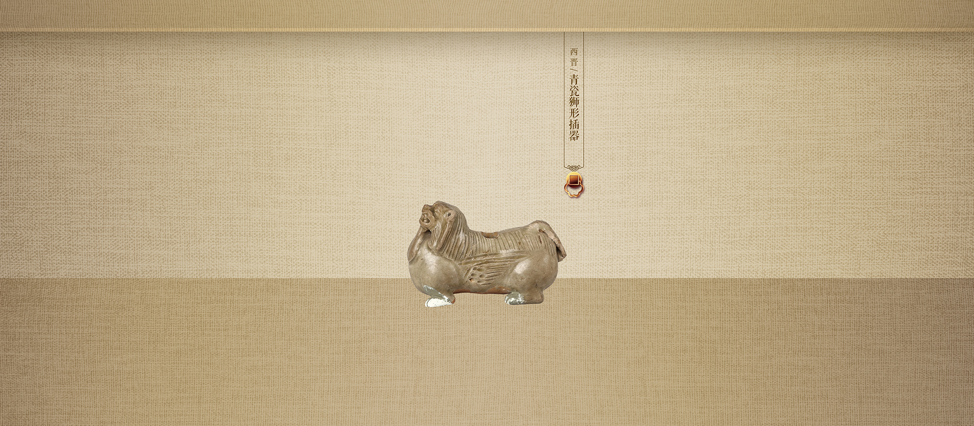 灰白胎,青釉,狮呈卧伏状,四足蜷于腹下,双眼圆睁,张口呲齿,颌下长须垂胸,颈脊刻饰鬃毛,腹部两侧刻饰灵动双翼,尾巴呈焦叶状,脊中部有一圆孔与腹部相通。