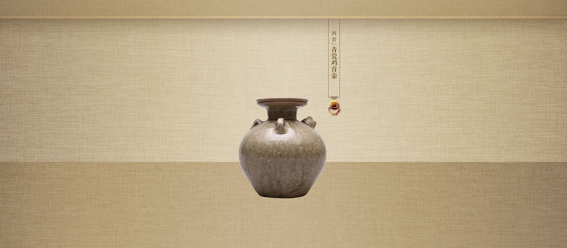 施青釉,浅盘口,直颈,斜肩,鼓腹,下腹微收,平底略内凹。肩部贴塑实心无颈鸡首及鸡尾,肩部饰两周弦纹内饰网格纹,肩附二竖系。