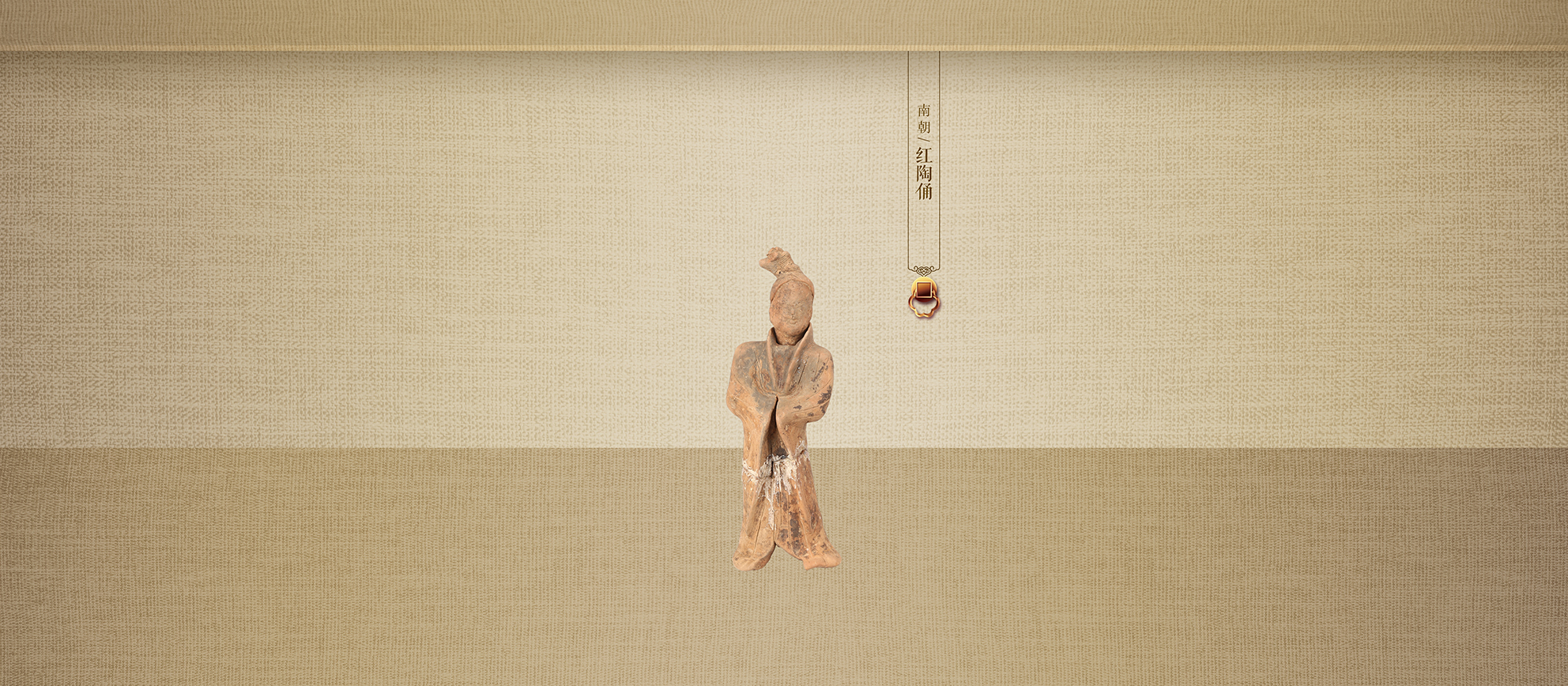 系泥质红陶,陶俑站立,发束于顶,高髻。眉目清秀,直鼻,小口,颌下有胡须。两眼正视前方,面庞饱满。陶俑内穿垂地长裙,外穿高领落地长袍,双手藏于长袖内,两袖搭于腹前。