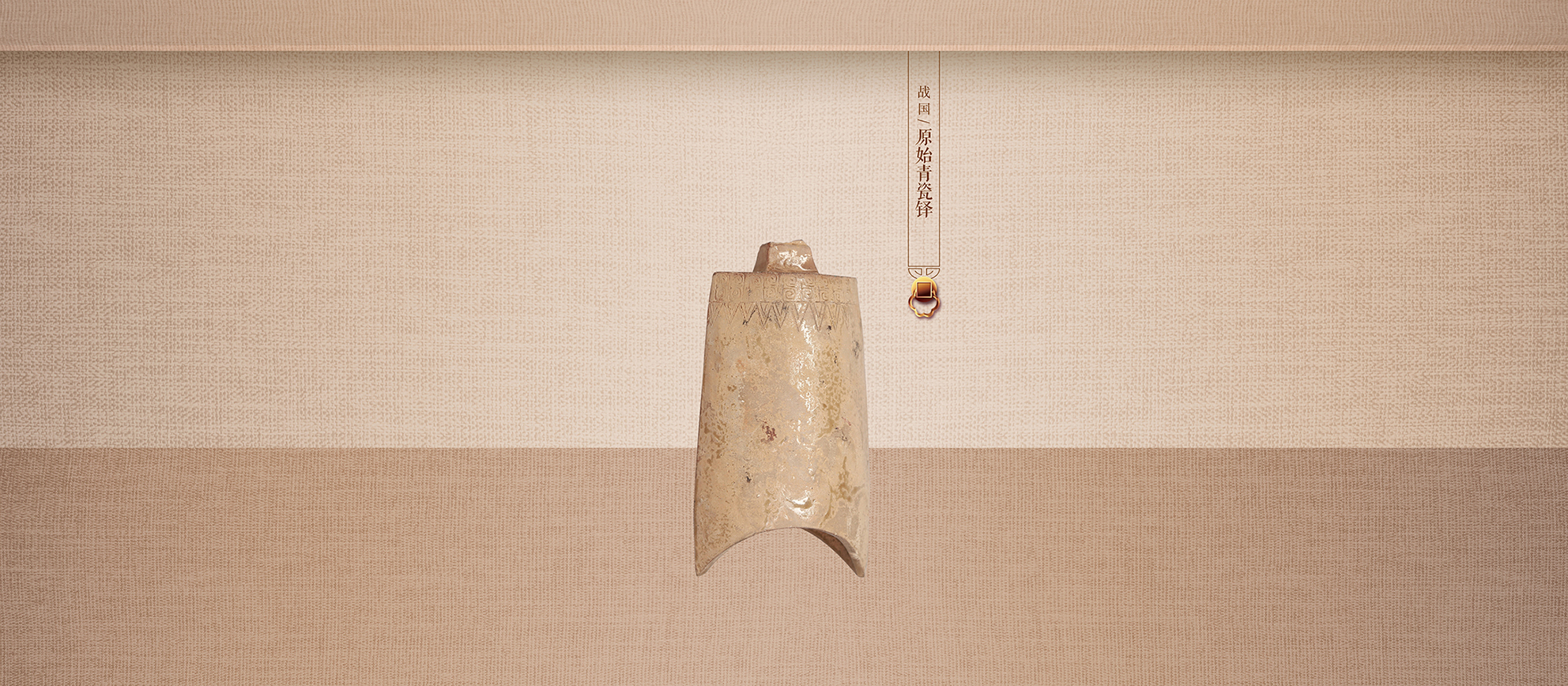 撞击乐器,盛行于春秋战国时期,用于军旅和田猎。《说文》:“铎,大铃也。”该原始青瓷铎,短銎,上部饰重三角纹,体作合瓦形,口部呈凹弧形,通体施青黄釉。
