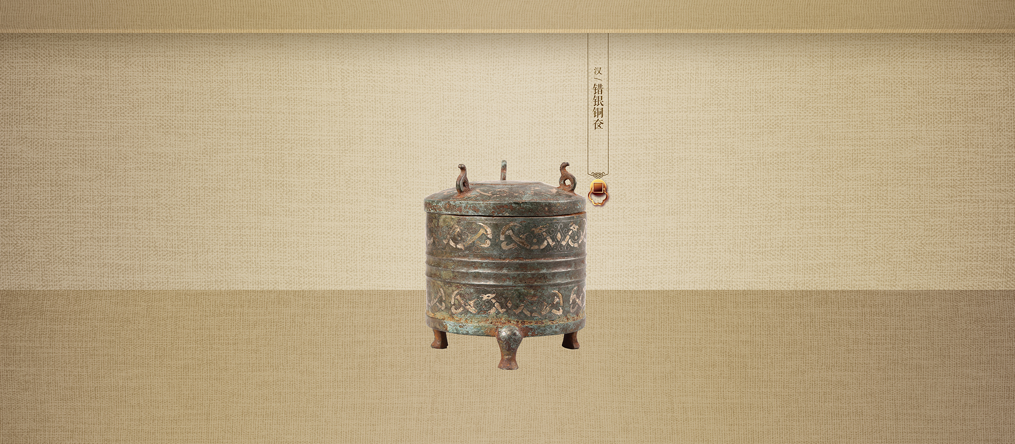 有盖,子母口,平底,三蹄足。盖面错银,置三环钮。腹部通体错银。腹中部饰宽带,铸工精细,具有一定的研究和观赏价值。