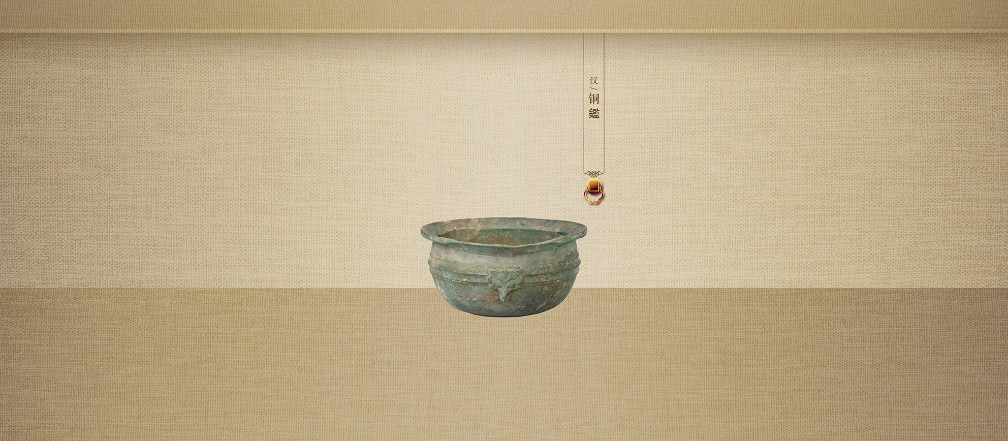 盛水器,圆形,口沿外折,平底。腹中部饰凸弦纹带,有一对称衔环兽面铺首。通体锈蚀,口沿修复,保存完整。