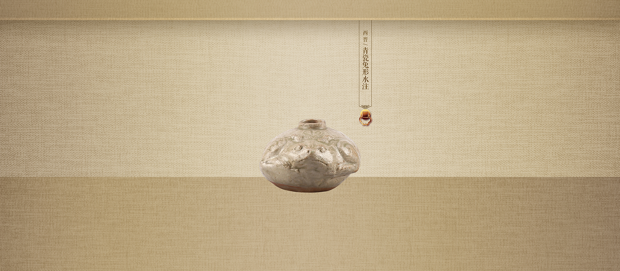 灰白胎,青釉,直口,广肩,鼓腹,平底略内凹,兔首及四肢装饰于器身呈伏卧状,形象生动。