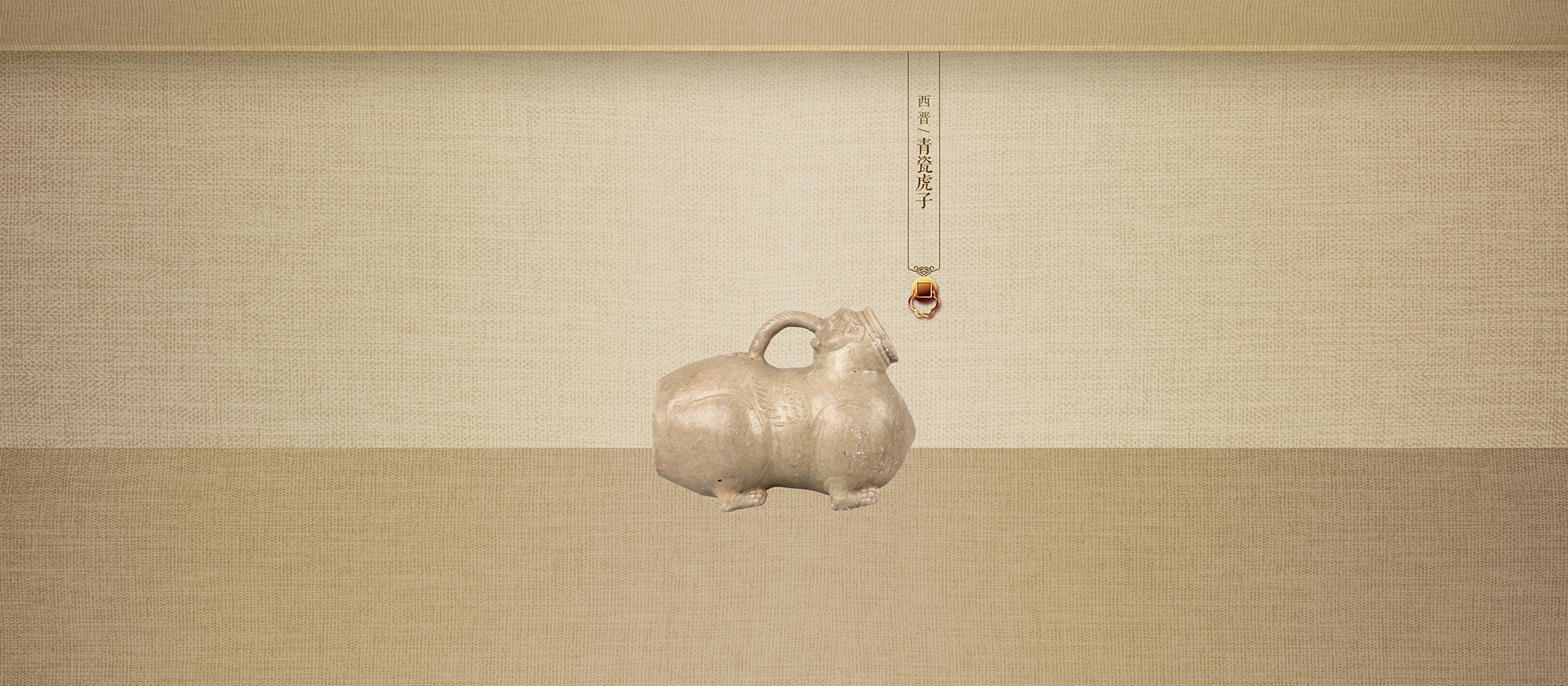 灰白胎,青釉,体似蚕茧,虎头作流,圆口微上昂,腰部稍内收,腹下四足呈卧伏状,腹部饰双翼,臀部圆形内凹,头部至臀部堆塑一拱形绳纹提梁,末端饰一尾。