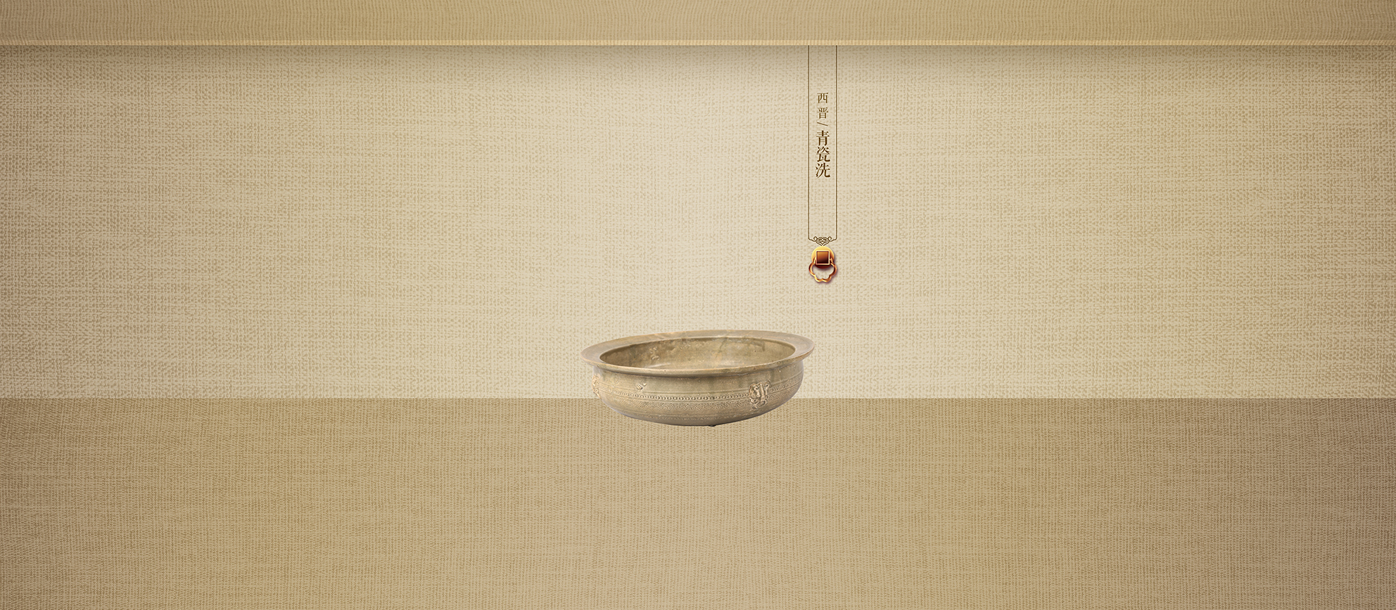 灰白胎,米黄釉,敞口,圆唇,折沿,沿宽略上翘,弧腹,平底内凹,外腹部有一周缠枝叶纹及弦纹组成的装饰带,在装饰带上贴塑四个衔环铺首。