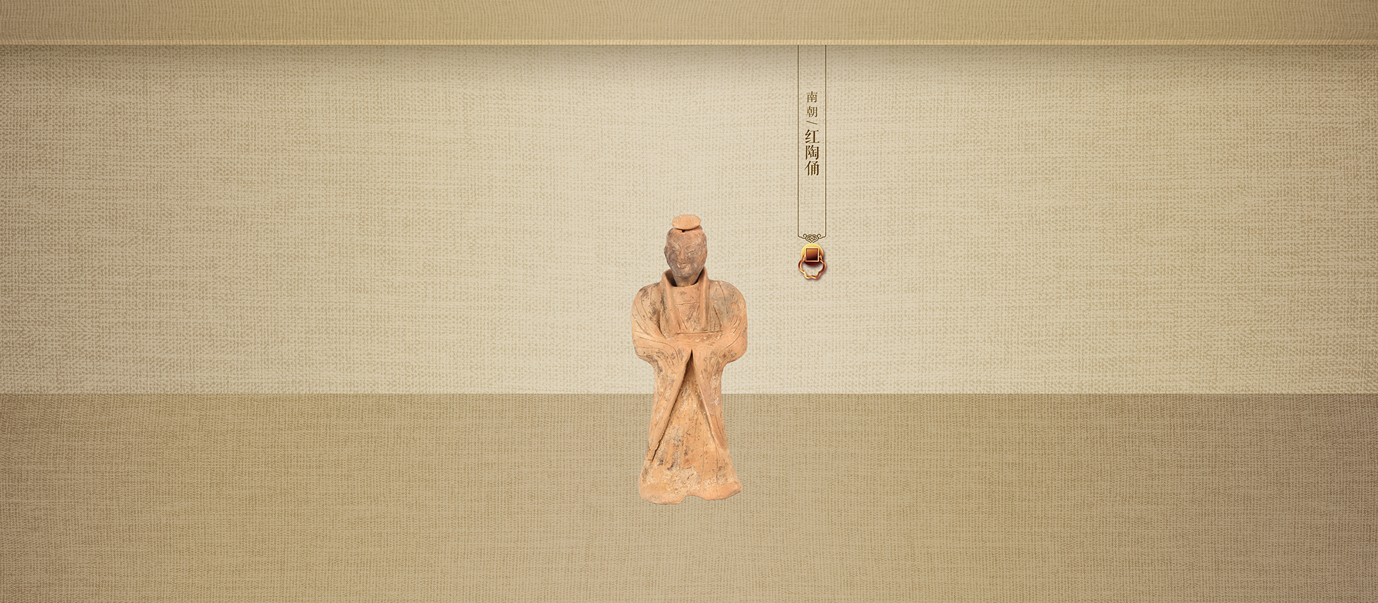系泥质红陶,陶俑站立,头梳卧髻,发前齐额,直鼻,小口,眉目清秀。陶俑内穿垂地长裙,外穿高领落地长袍,双手藏于长袖内,两袖搭于腹前。