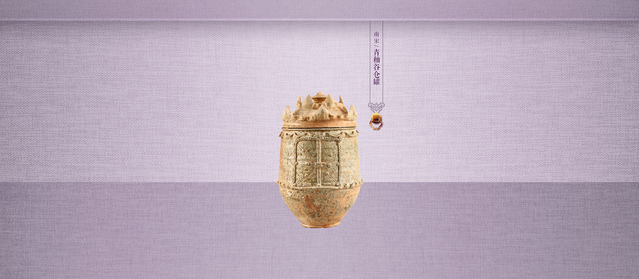 灰胎,青釉。直口,深直腹,圆饼形底。器盖呈弧形,盖面贴塑两周牛角纹,纽为圆饼形,下腹内收。口沿下及腹下部贴塑两周泥条形水波纹,腹部刻划五谷丰登图案,并饰有两开门,方形门框四边饰水波纹,内刻划“米”字形框架,米字线内有大小凸圈点纹。通体施青釉。
