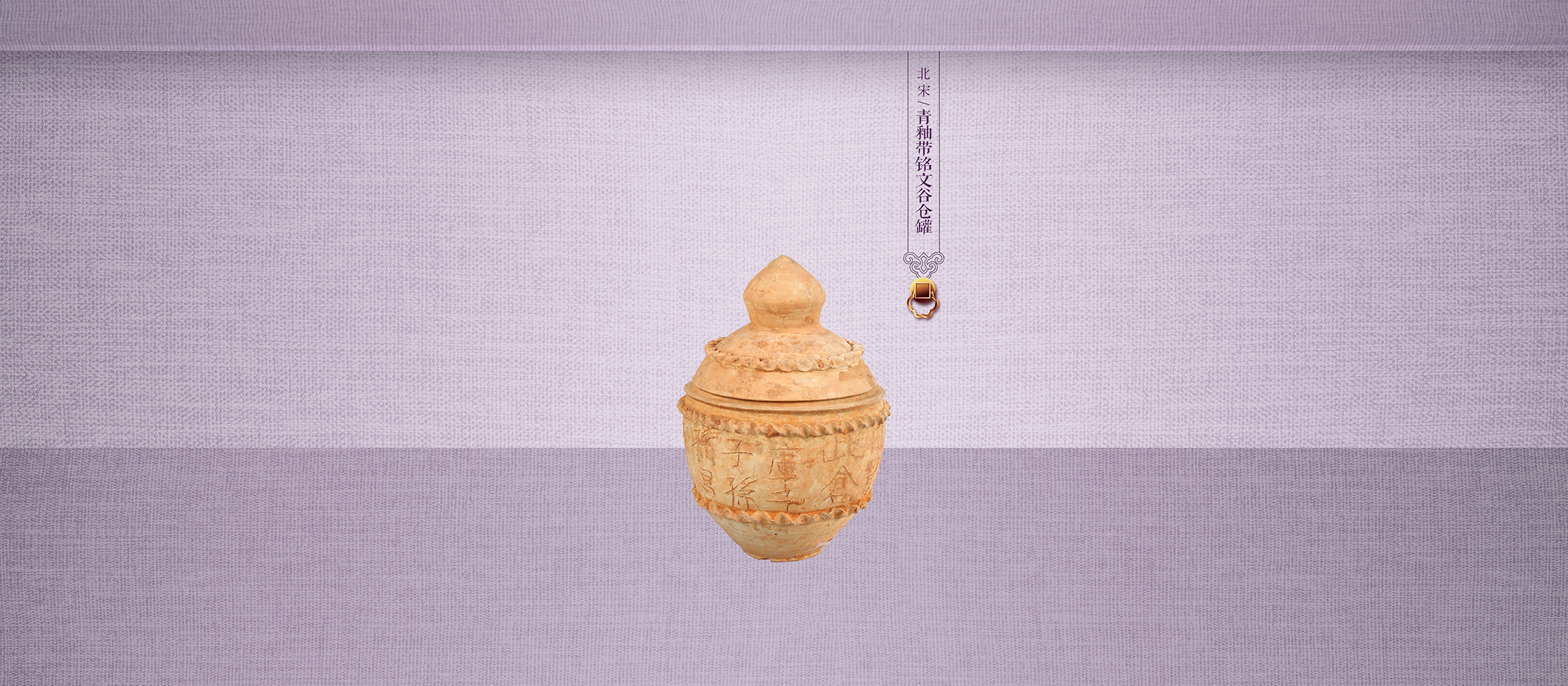 灰胎,直口,直口,深直腹,圆饼形底。器盖呈弧形,宝珠形钮。口沿处有一周凸棱,器身捏塑水波纹两周,腹中部有铭文“此仓库子子孙孙昌盛富贵大吉大利慧之庚癸酉年七月口胄”,器盖捏塑水波纹一周。通体施青釉。