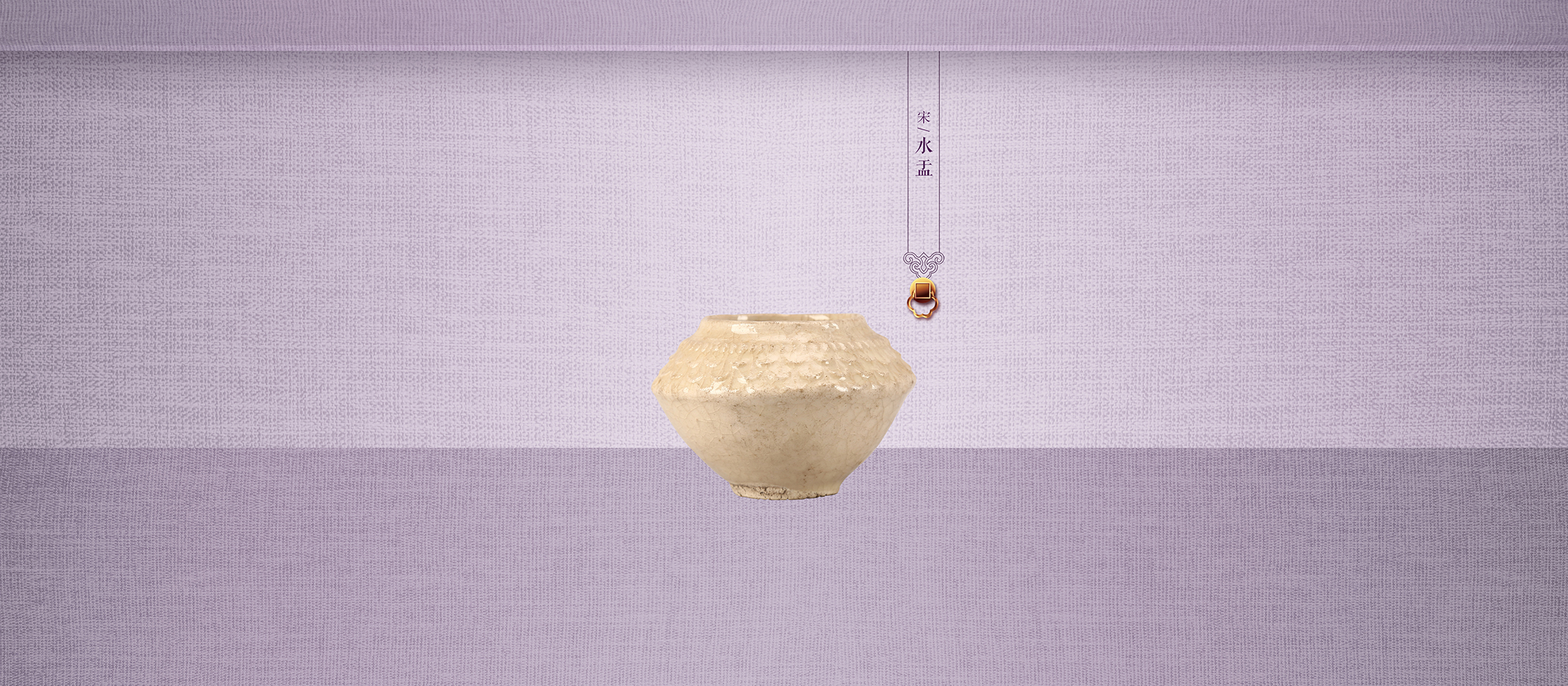 圆唇,敛口,折肩,折腹,圈足。腹上部刻划一周水波纹,花瓣纹三周。通体施青白釉,釉质纯净。胎薄体轻,造型小巧精致。